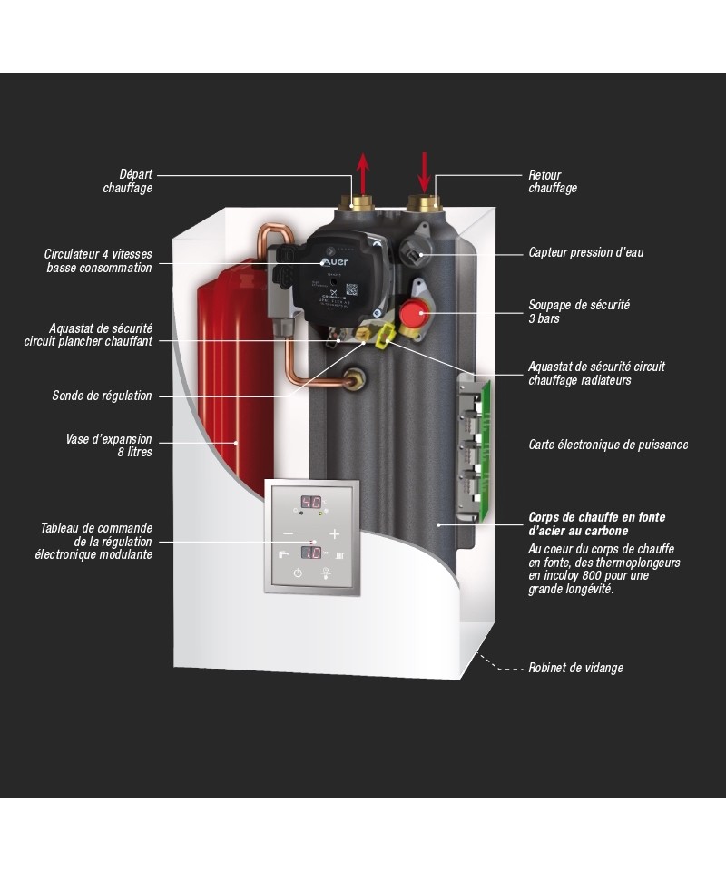 Accès à tous les composants hydrauliques par l’avant de la chaudière.