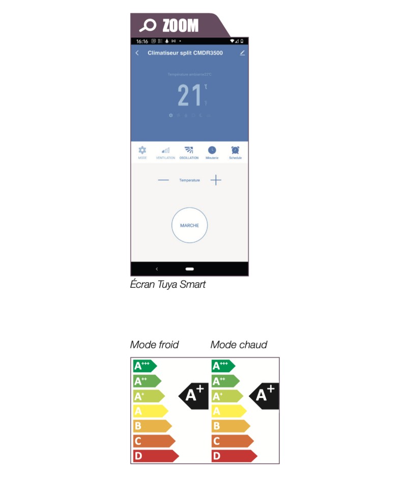 Grâce à sa connexion Wi-Fi intégrée et à l'application Tuya Smart, il est possible de piloter le climatiseur à distance : température, vitesse de ventilation, modes de fonctionnement, programmation. L'appareil dispose également d'un écran LED intuitif ainsi que d'une télécommande infrarouge fournie avec piles.