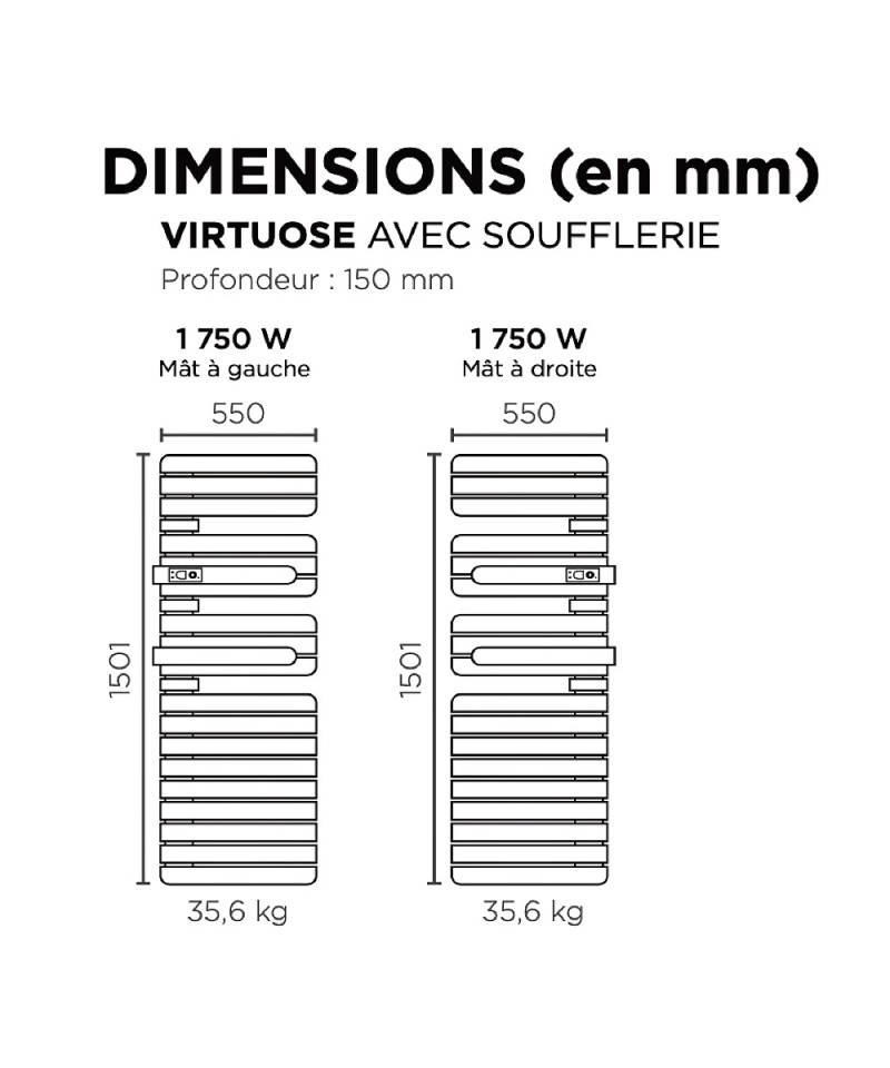 | 483131 | 1750 W | àgauche | 550 x 1501 x 150 | Blanc Mat /Entretoise chêne clair | 36.5 Kg |