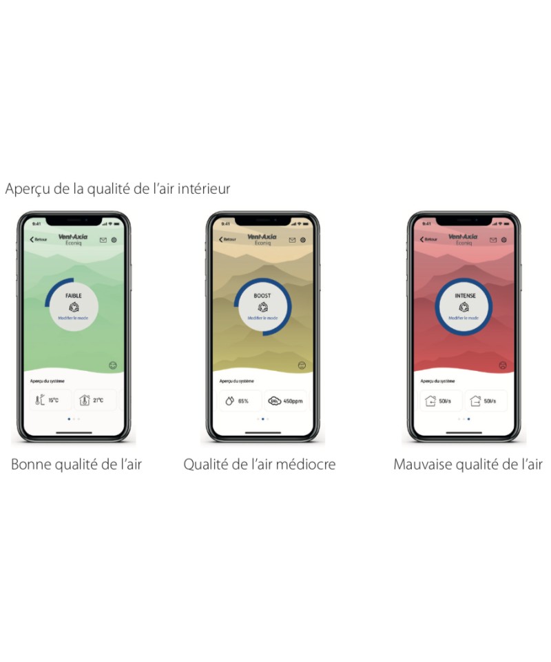 Vent-Axia Econiq extrait l’air pollué vers l’extérieur et fournit de l’air extérieur frais et filtré aux espaces de vie. Les unités de ventilation disposent de tous les éléments nécessaires pour créer un climat intérieur sain et informent l’utilisateur par le biais d’un code couleur sur l’application.