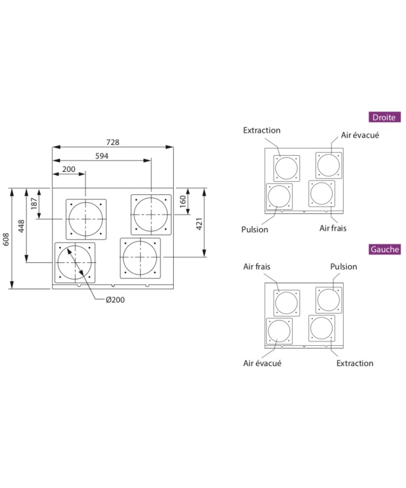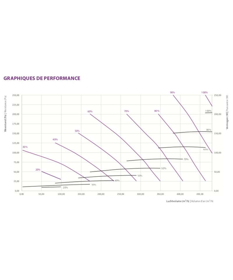 Débit d’air : 450 m3/h à une résistance de +200Pa ;
